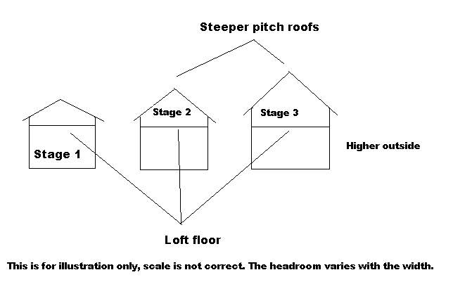 • Stage II - is most suited for storage and is much better for headroom for sleeping.  We keep the outer walls at 8ft. Insert the loft floor at 80" from the floor BUT we steepen the pitch of the roof to give you more headroom ! Much better already.